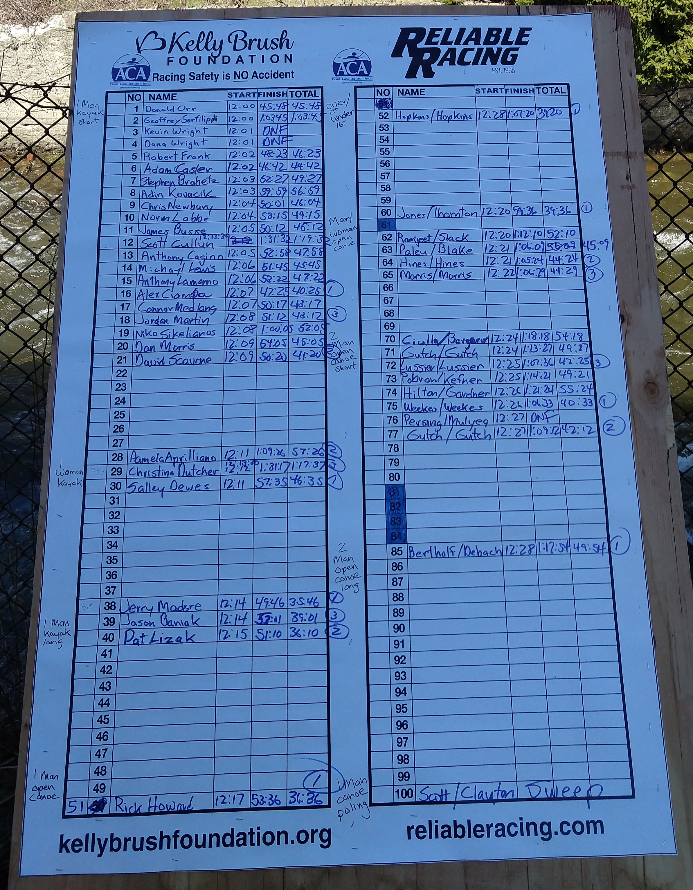 | Number | Name | Start Time | Finish Time | Time | Place | Division |